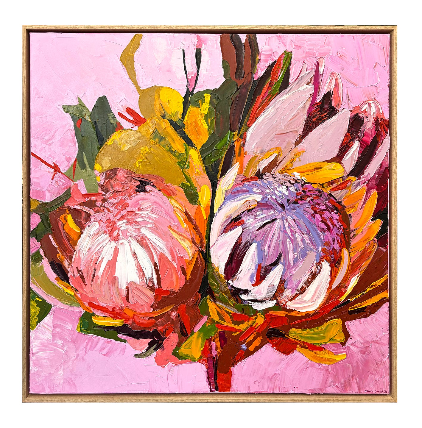 Nancy’s vibrant florals, sculpted through thick layers of paint, capture the
